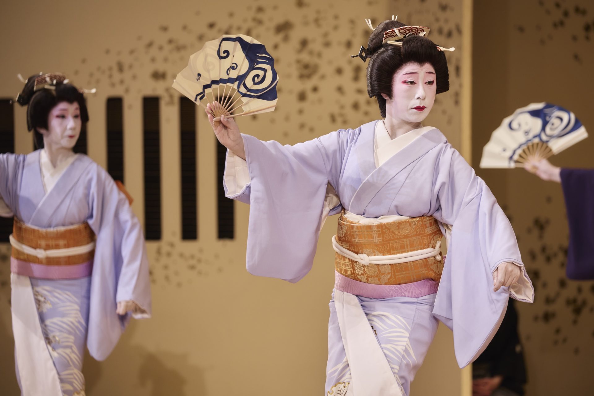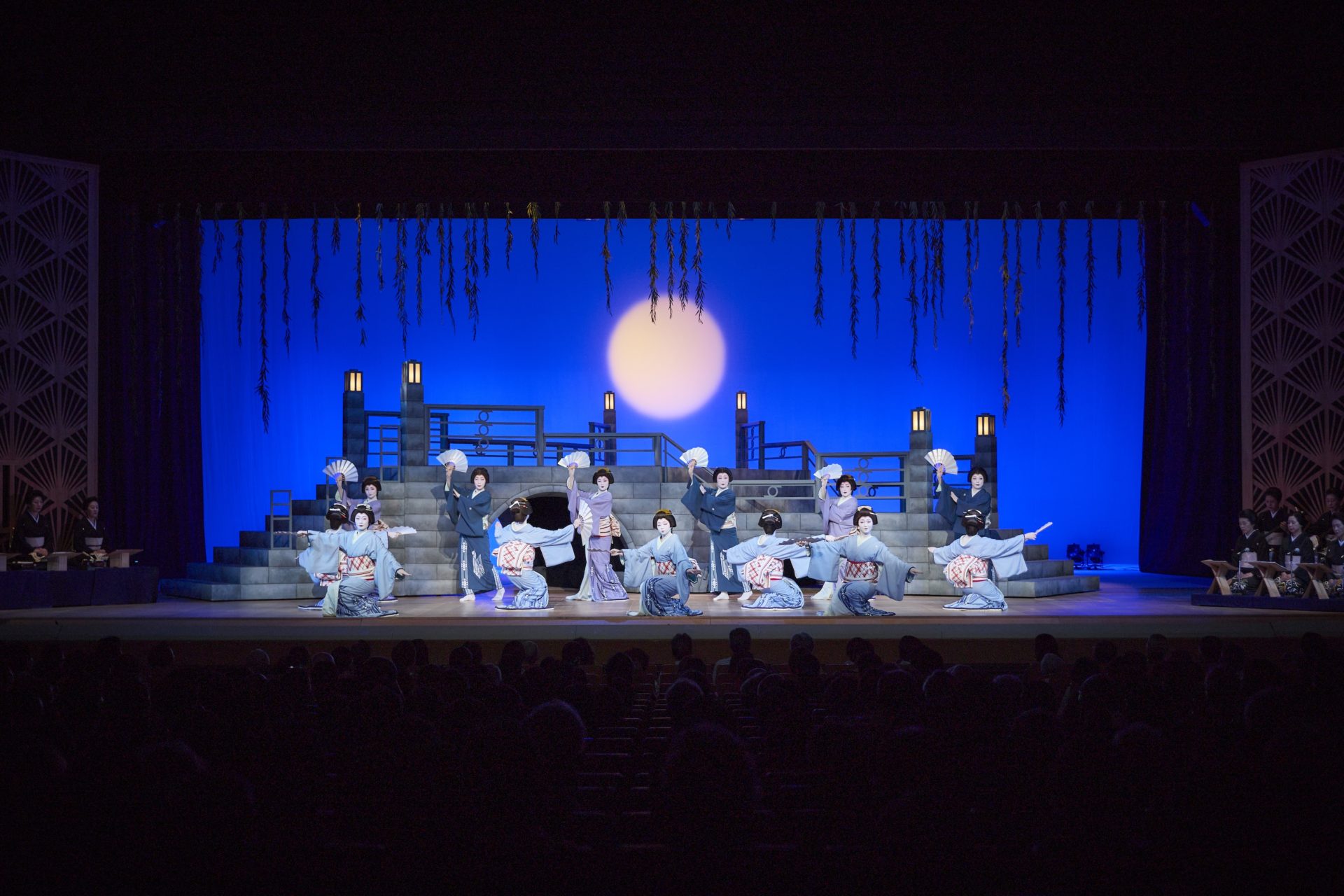休憩無しの二幕目、ここが各地の芸者衆の踊りです。二花街から五花街が日替りで出演、それぞれの色を競う七日間となります。休憩を挟み三幕目、テンポよく転換する楽曲もさまざまなお好みの舞台、ここに新橋芸者衆は出揃います。それは暗転からの口上、フィナーレへ続き終幕を迎えます。